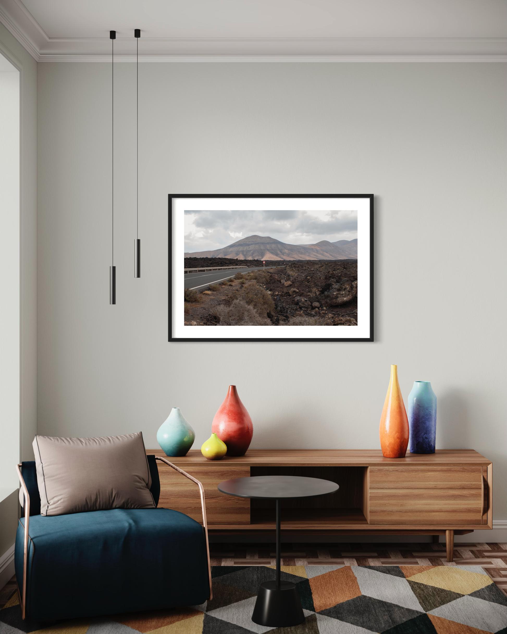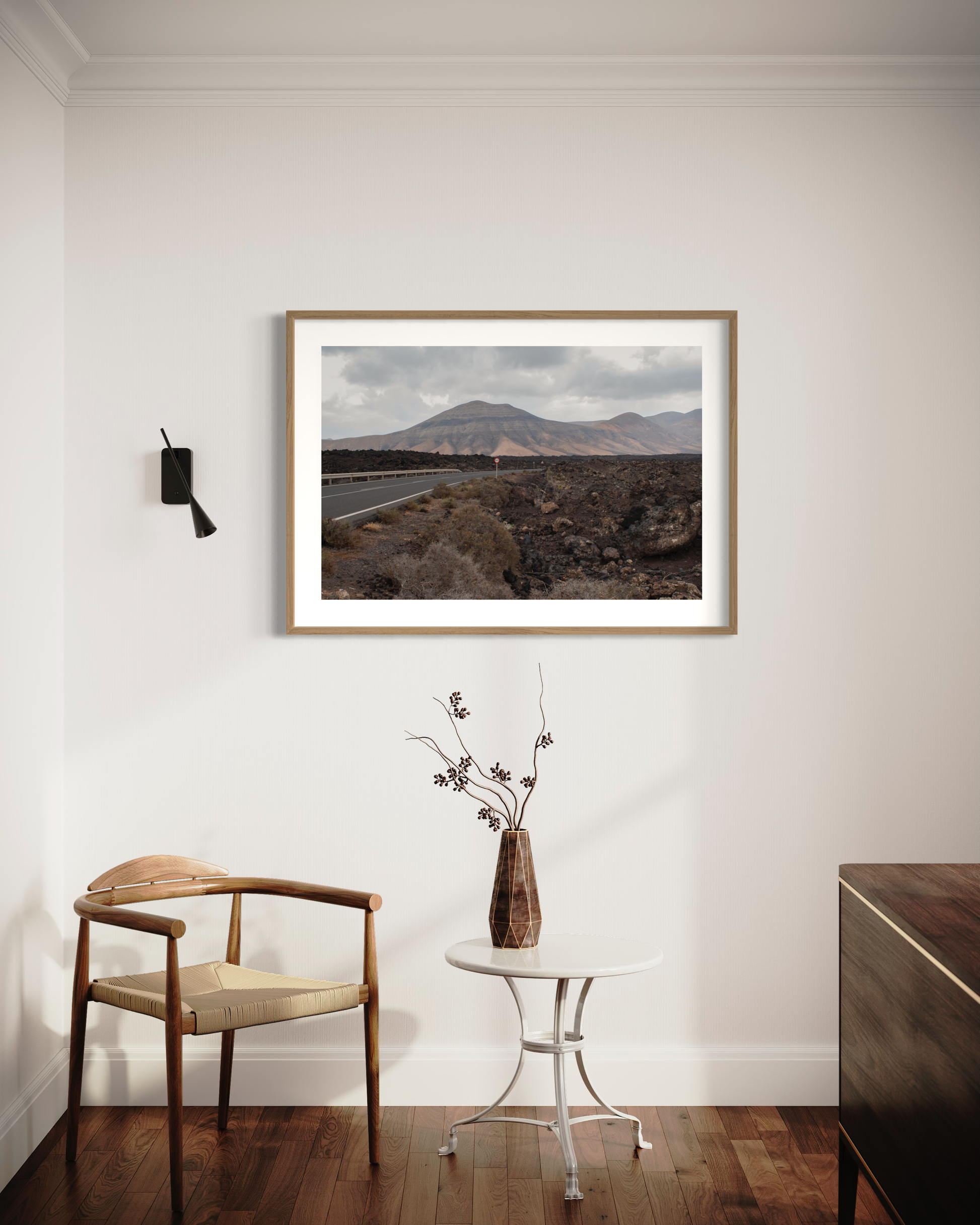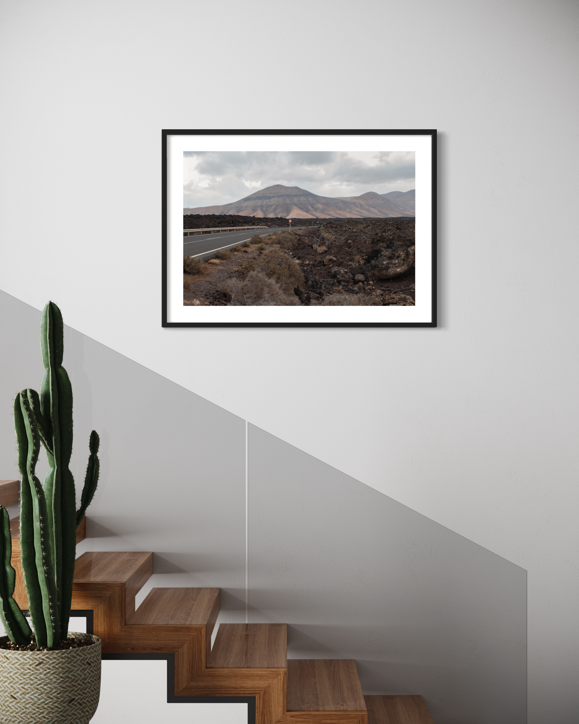 This photography print showcases the surreal and lunar landscapes of Timanfaya National Park in Lanzarote, Spain. The perspective view of the volcano shows the stark contrast of black volcanic rock against the dark sky, the dramatic scenery and the unique geological formations. Nature's artistry on full display.